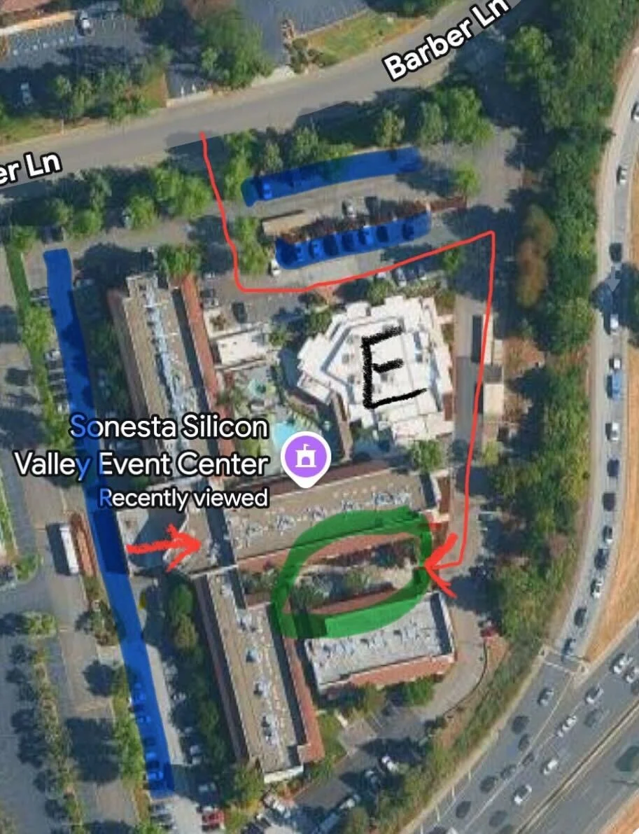 Park at the Event Center (E) and walk along the long red arrow around the Event Center and enter the courtyard through the gate.